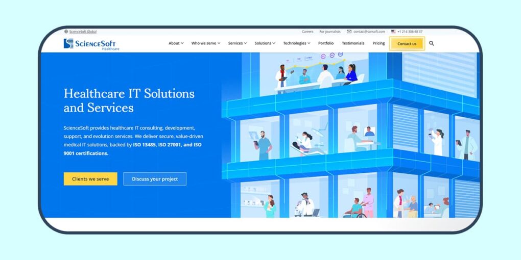 ScienceSoft is one of the top healthcare development companies, with over 18 years of expertise in creating medical-grade systems for hospitals, labs, medtech firms, and health startups. Its healthcare portfolio includes customized EHR/EMR offerings, patient and provider portals, lab information management systems (LIMS), medical billing software, and AI-powered analytics platforms.